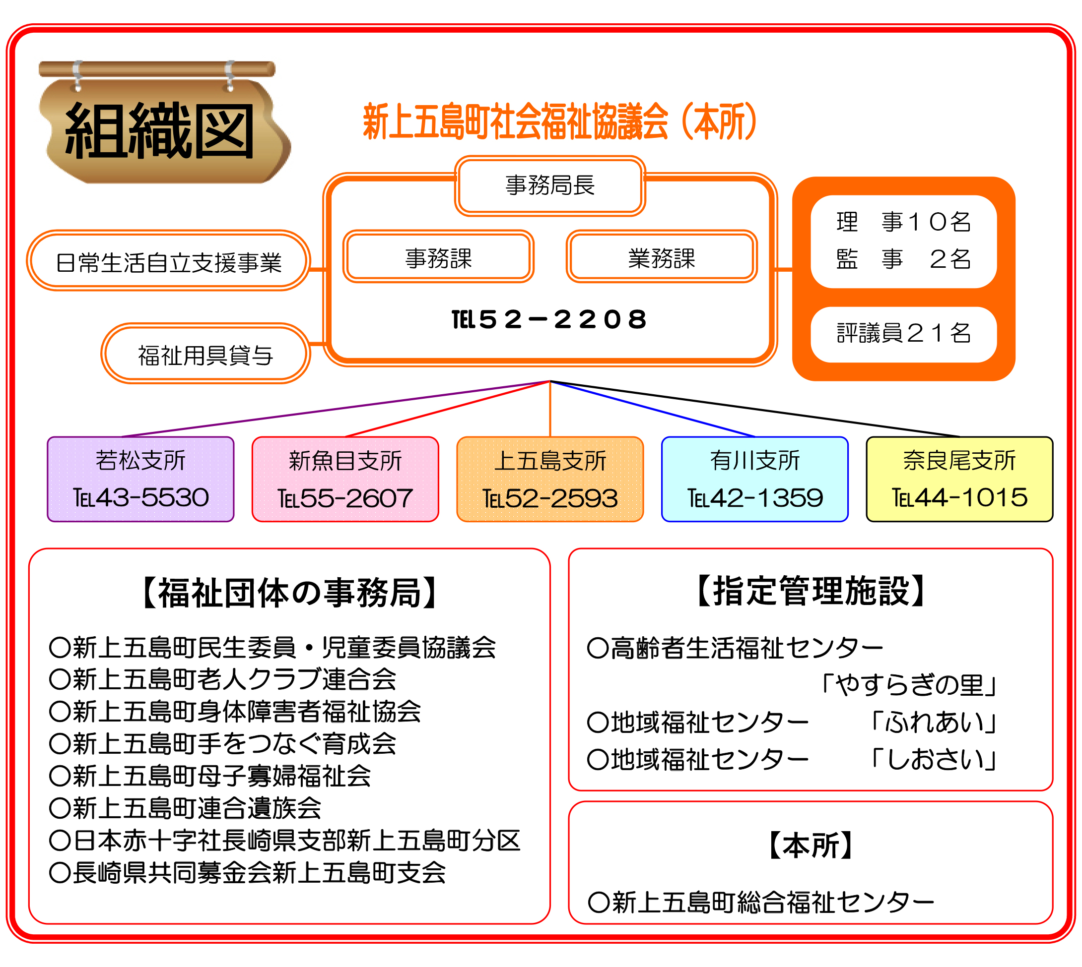 - 平成16年7月31日、旧5ヶ町(有川町・上五島町・若松町・新魚目町・奈良尾町)社協が合併し設立